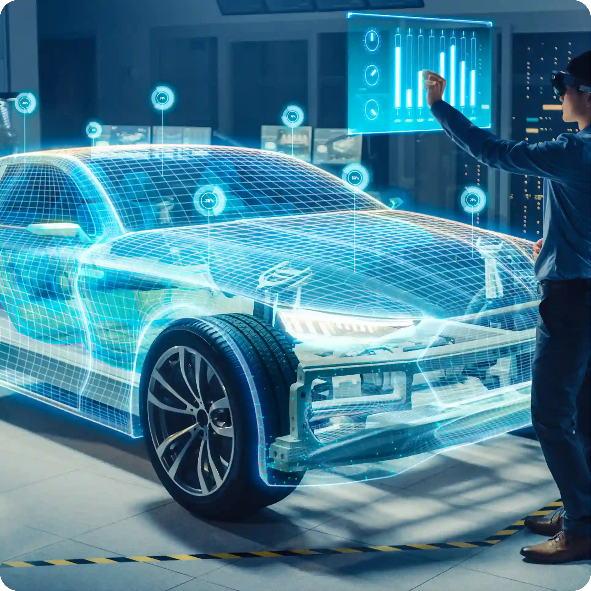 Karosserieentwicklung & Fahrwerk Antriebstechnik & Powertrain Exterior Entwicklung Interior Entwicklung Sitzentwicklung, Lichtsysteme und Dachsysteme Berechnung für Steifigkeit, Festigkeit, Betriebs- und Dauerfestigkeit NVH (Noise Vibration Harshness) Insassenschutz und Fußgängerschutz bzw. Crashberechnung